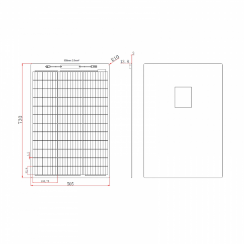 Technical drawing of black 60W fibreglass semi-flexible solar panel (FLAXB3-60M)